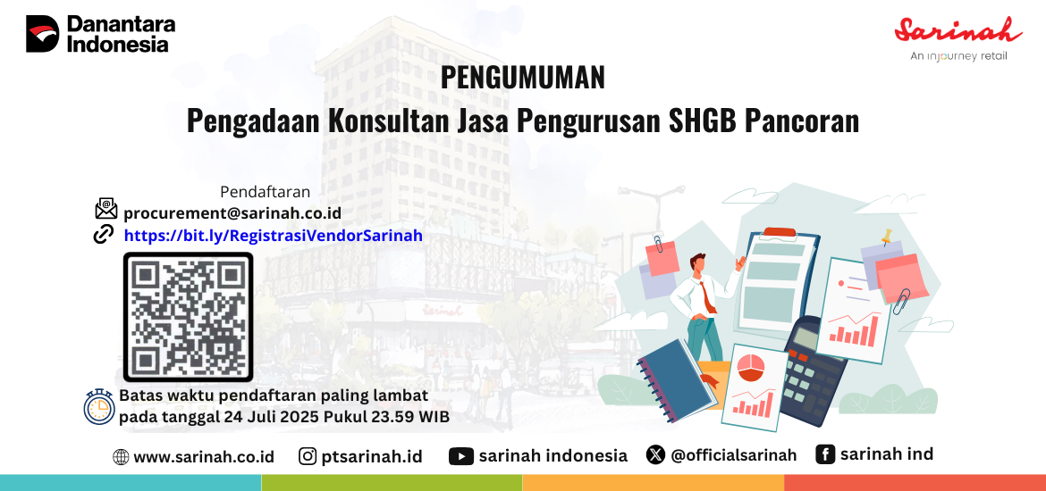 Jika berminat dapat mengirimkan surat pernyataan dengan judul "Surat Pernyataan Minat Pengadaan Konsultan Jasa Pengurusan SHGB Pancoran" ke procurement@sarinah.co.id paling lambat 24 Juli 2025 pukul 23:59.