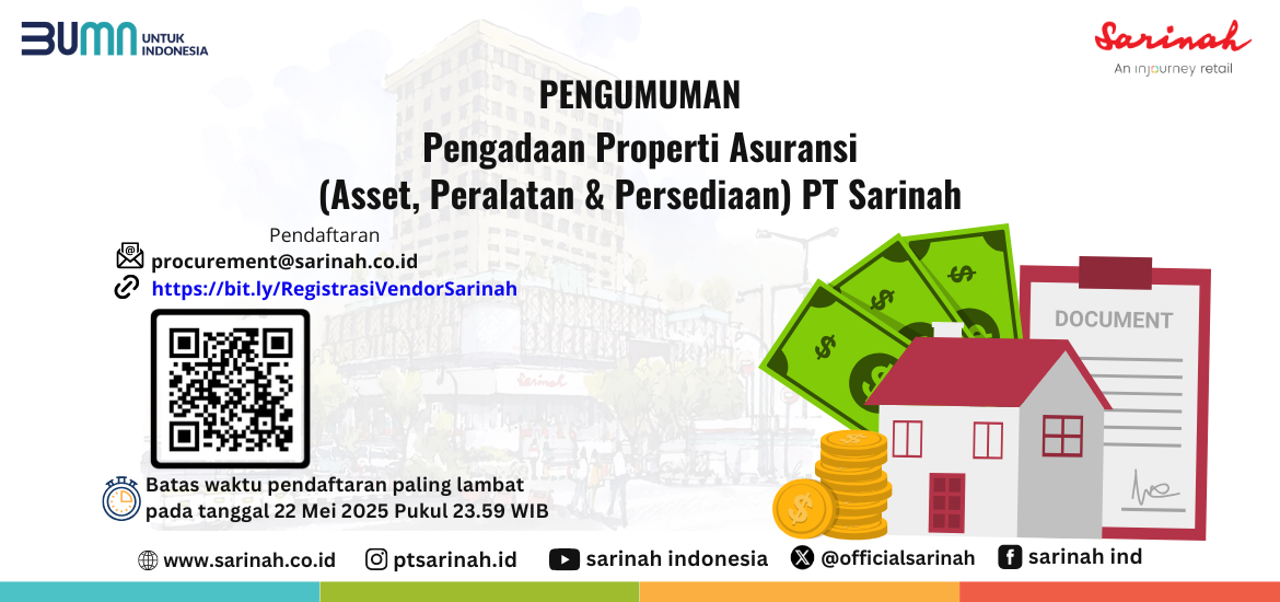 1. Jika berminat dapat mengirimkan surat pernyataan dengan judul “Surat Pernyataan Minat Mengikuti Pengadaan Properti Asuransi (Asset, Peralatan & Persediaan) PT Sarinah” ke procurement@sarinah.co.id paling lambat pada 22 Mei 2025 pukul 23.59.