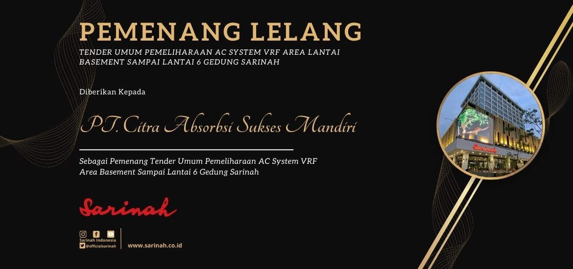 Pengumuman Pemenang Tender Umum Pemeliharaan AC System VRF Area Lantai Basement Sampai Lantai 6 Gedung Sarinah