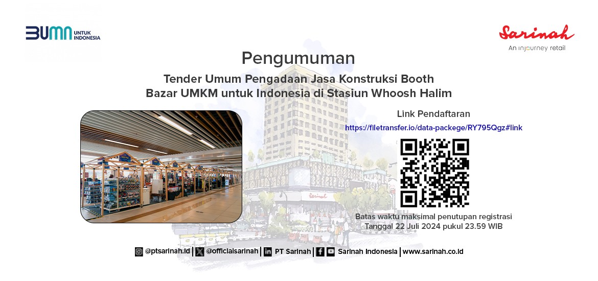 Jika berminat dapat mengirimkan surat pernyataan dengan judul “Surat Pernyataan Minat Mengikuti Jasa Konstruksi Booth Bazar UMKM Untuk Indonesia di Stasiun Whoosh Halim” ke procurement@sarinah.co.id paling lambat pada 22 Juli 2023 pukul 23.59 wib.