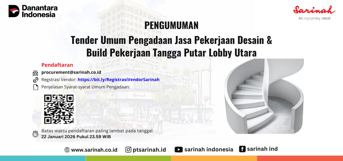 1. Jika berminat dapat mengirimkan surat pernyataan dengan judul Pengadaan Jasa Pekerjaan Desain & Build Pekerjaan Tangga Putar Lobby Utara ke procurement@sarinah.co.id paling lambat pada 22 Januari 2026 pukul 23.59.