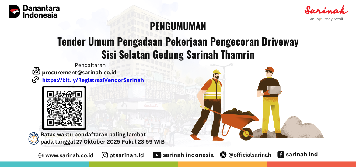 Jika berminat dapat mengirimkan surat pernyataan dengan judul “Surat Pernyataan Minat Mengikuti Pengadaan Pekerjaan Pengecoran Driveway Sisi Selatan Gedung Sarinah Thamrin” ke procurement@sarinah.co.id paling lambat pada 27 Oktober 2025 pukul 23.59.